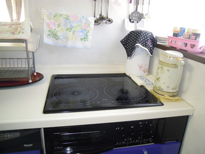 キッチンは対面キッチンで、料理をしながら会話も弾みます。キッチンIHクッキングヒーターでらくらく便利に調理ができます。調理器具一式、食器一式ご用意してあります。BBQの下ごしらえもキッチンでどうぞ。